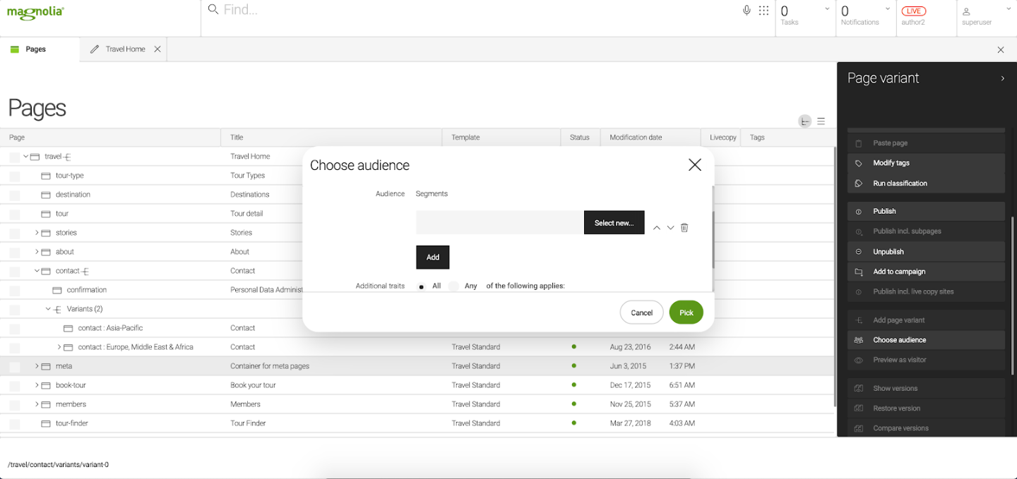Dies wird erreicht, ohne dass die Erstellung von Inhalten beeinträchtigt wird, da die Vermarkter auch auf benutzerfreundliche Tools zugreifen können, einschließlich WYSIWYG-Bearbeitung und Erlebnisvorschau. Aber ein digitales Erlebnis wäre nicht vollständig ohne die Möglichkeit, diese Inhalte für verschiedene Zielgruppen zu personalisieren. Magnolia enthält eine sofort einsatzbereite regelbasierte Personalisierung, die zur Optimierung von Inhalten auf verschiedenen Kanälen und für ein maßgeschneidertes Erlebnis genutzt werden kann.